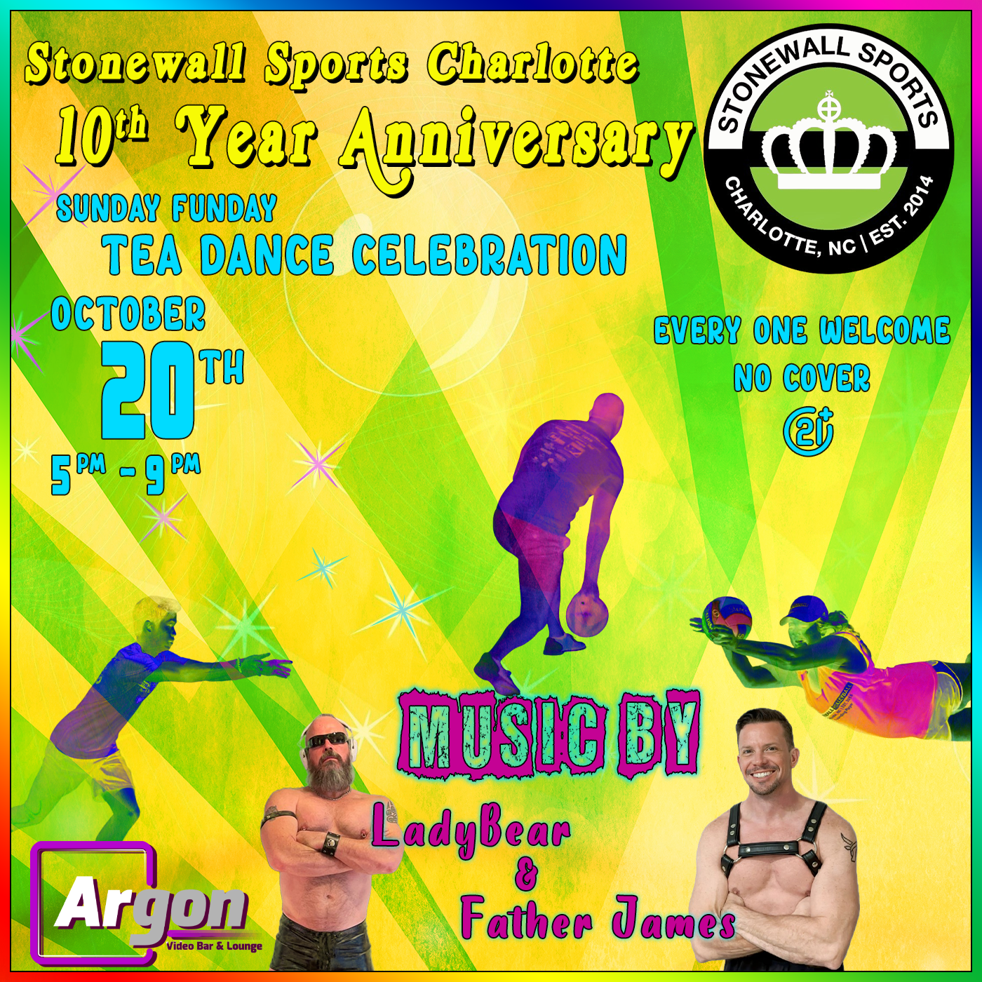 Stonewall Sports is celebrating 10 years in the Charlotte community! Come out Sunday for some amazing afternoon fun. Music and mayhem provided by DJ LadyBear and Father James. Plus we have the local Arts Market off the patio so it will be a fantastic day of fun, dance, crafts and community. Doors open at 5pm. No cover. Plenty of parking. 21 and up. So start your day off at Sidelines Sports Bar and the jump into the mix at Argon from 5pm - 9pm.